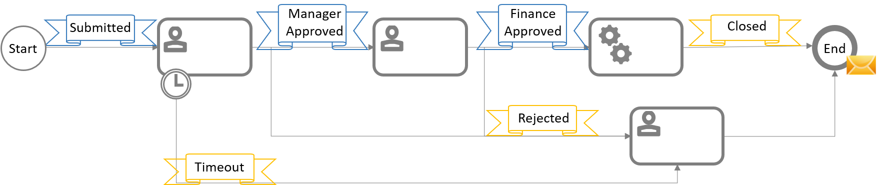 An event is something that happens during a process. Except for the None Start Event, events generally do not require user interaction. All processes must start with a start event and end with at least one end event.