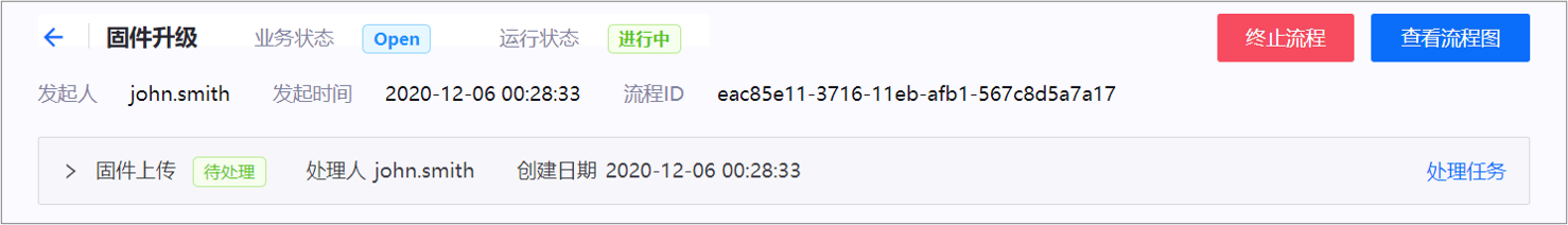 此时出现流程详情页面,其中会显示流程属性、状态以及所涉及的任务。