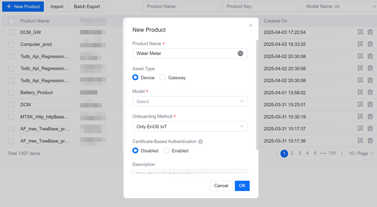 Onboarding Method: The method by which the device under this product is connected to EnOS. Only supports Only EnOS IoT, which means access through EnOS standard JSON data.
