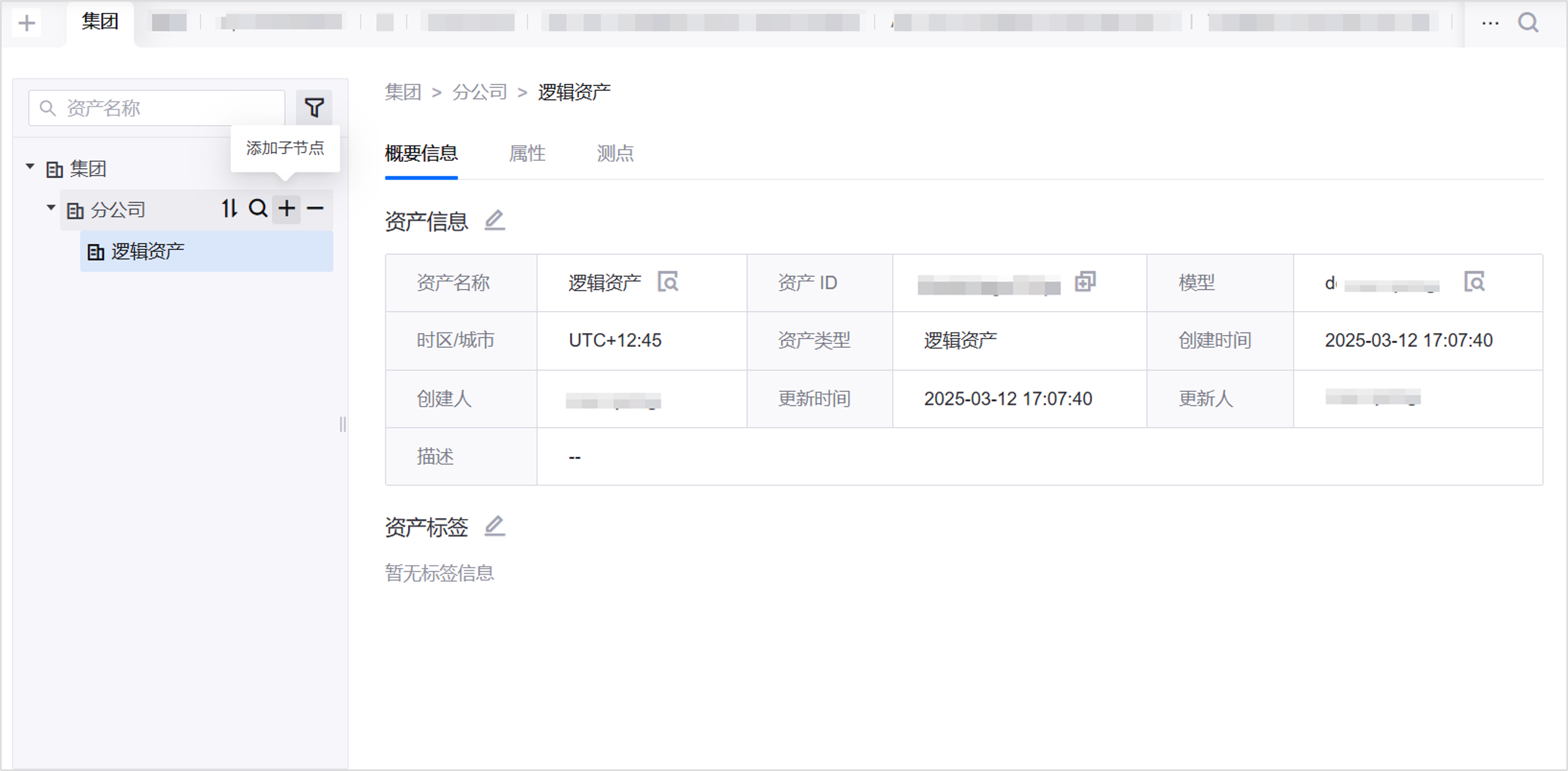 在资产树中选择一个节点,该节点将作为该逻辑资产的父节点。选择该节点对应的 + 添加子节点。