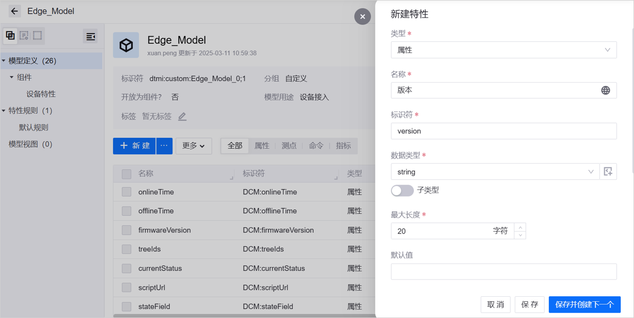 3. 在模型详情页面,参见 新建模型要素 新建以下属性: