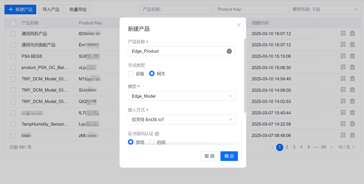 你需要创建一个名为 Edge_Product 的产品。本教程假设该型号的 EnOS Edge 设备通过 EnOS IoT 标准格式上送数据,且数据传输不使用 CA 证书加密。