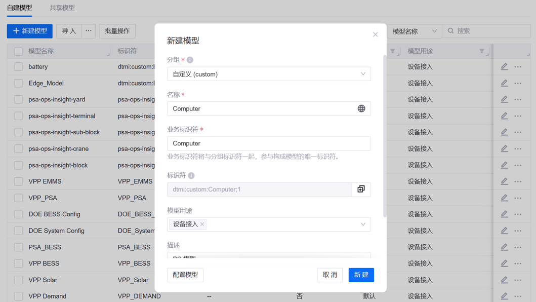 2. 在模型详情页面,参见 新建模型要素 新建以下属性和测点: