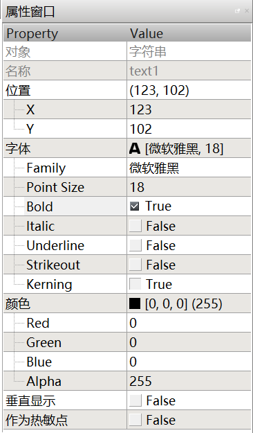 2. 在页面右侧 属性窗口 或者弹出的属性窗中设置图形的属性,就可完成在作图区插入选择的基本图形。以插入文本为例,文本属性窗口如下图所示: