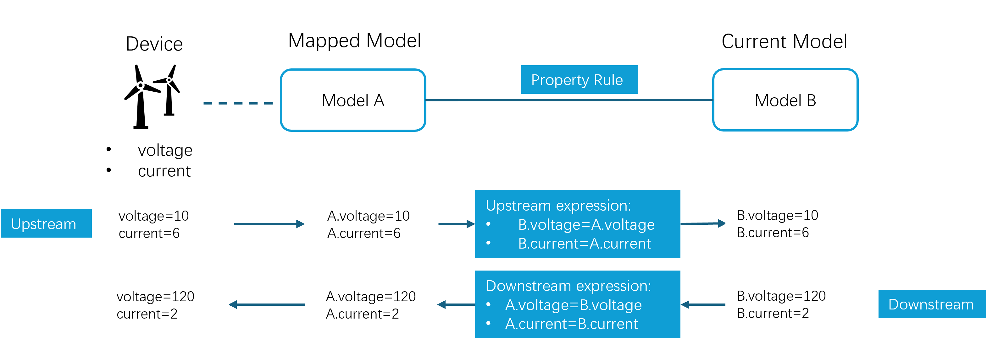 Upstream Expression: Logic for mapping from the mapped model to the current model. For example, mapping device data from an onboarding model to a business model.
